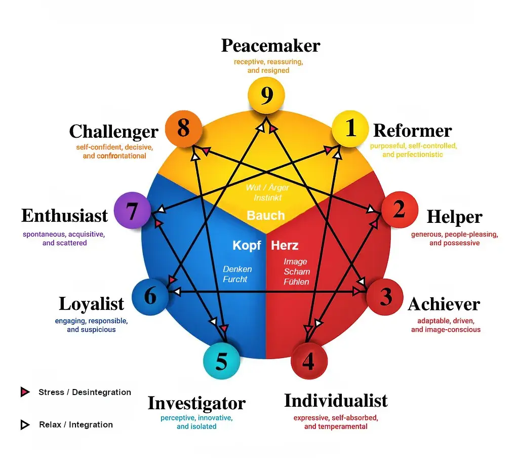 Im Zentrum steht die Triade von Bauch, Herz und Kopf (BHK), die jeweils für die Grundbedürfnisse Autonomie, Beziehung und Sicherheit stehen. Durch die Kombination von Strukturtyp (9 Charakteren) und Spannungsfeld (Temperamente) entsteht ein tiefes Verständnis für individuelle Bewegungsmuster und Beziehungsdynamiken.